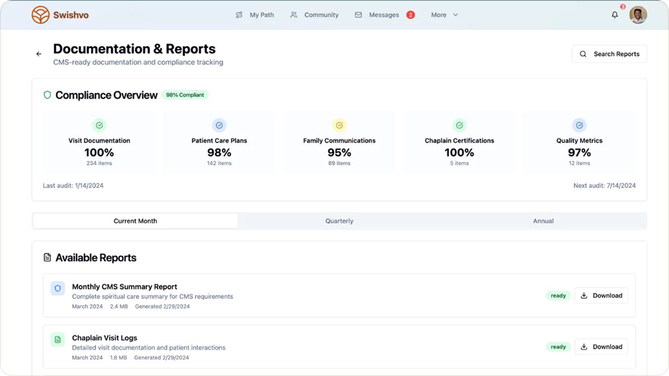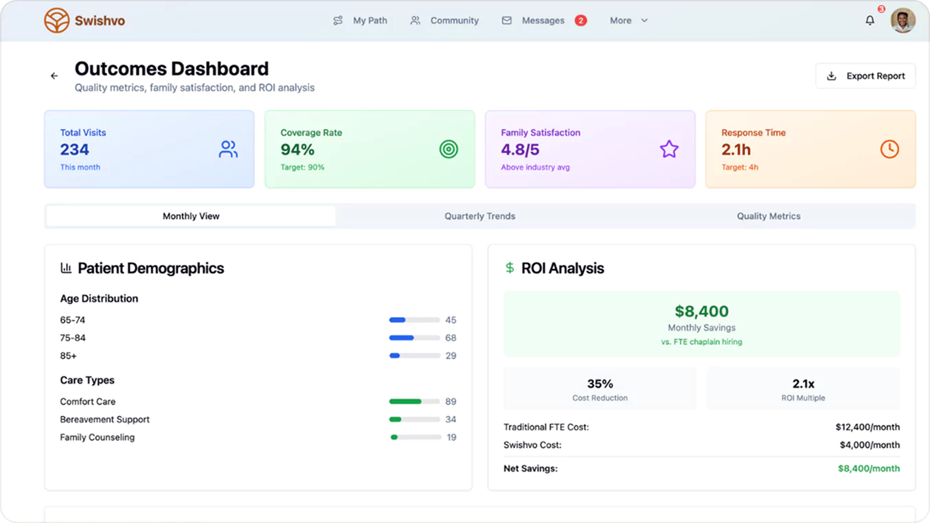 Hospices know the struggle: regulations require chaplains, but reimbursements rarely cover their value. Providers carry emotional labor without sustainable pay. Families miss out when budgets fall short. Swishvo changes this by:
